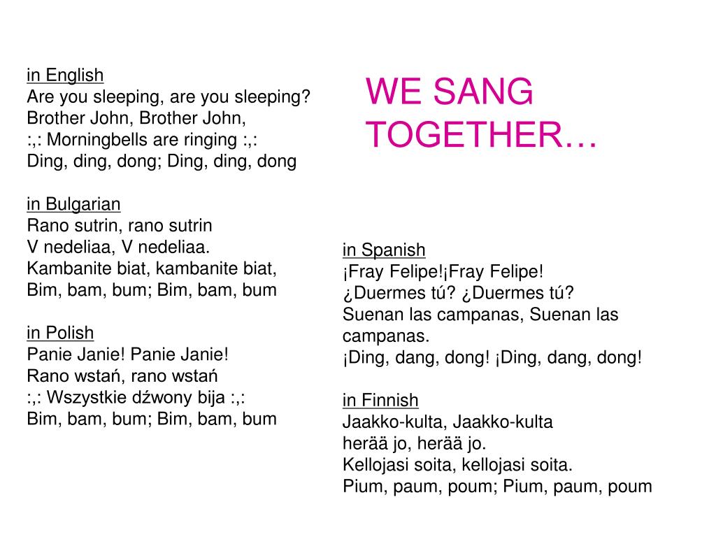 Are You Sleeping Brother John French Lyrics. Brother john, brother john, morning bells are ringing! Morning bells are ringing, morning bells are ringing, ding, ding, dong! The song is also known as "brother john", or in various european languages as dutch: See more of our folk and french songs. Frère jacques (are you sleeping?) traditional song lyrics and.